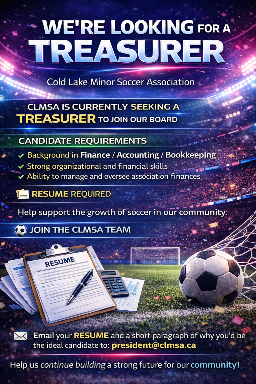 Cold Lake Minor Soccer Association (CLMSA) is currently seeking a Treasurer to join our volunteer board and help support the continued growth and success of soccer in our community.